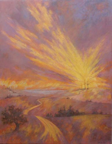 is reddish-purple, the color of penance. The landscape, a hilly road and a