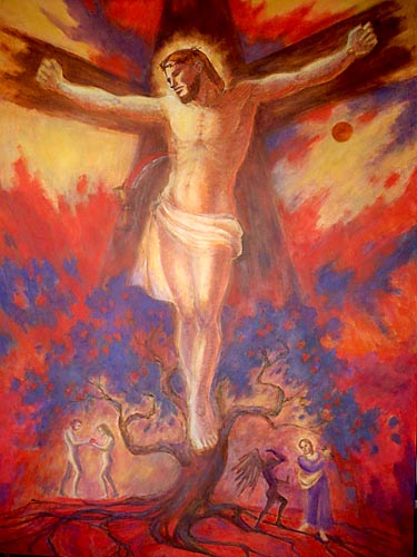 | This painting attempts to describe the horrific event and its purpose through jagged, abstract expressionist forms and colors. The color of purple represents His taking on our sins and illnesses through His passion and death, which are symbolized by red. Blood and water pour from His lanced side into a Eucharistic cup. Physically this was a piercing of the pericardium, thus causing water and blood to flow. Spiritually, water purifies and blood redeems. At the bottom, the tree from which Adam and Eve ate has become a cross. Through the obedience of One, Christ died for many, becoming as a new Adam; hence, “Good” Friday (O happy fault). We also participate in His suffering and death in whatever we need to die to and be freed from. On the other side of the tree Christ is destroying the power of evil and taking the keys of death from the enemy. The battle is the Lord’s and through His passion and death we are given the grace and ability to do what we could not do ourselves. Note that the enemy is small and ugly to Jesus—only a fallen archangel. Through the crucifixion, God has sent a Savior to forgive, rescue, heal, set free and transform. |
